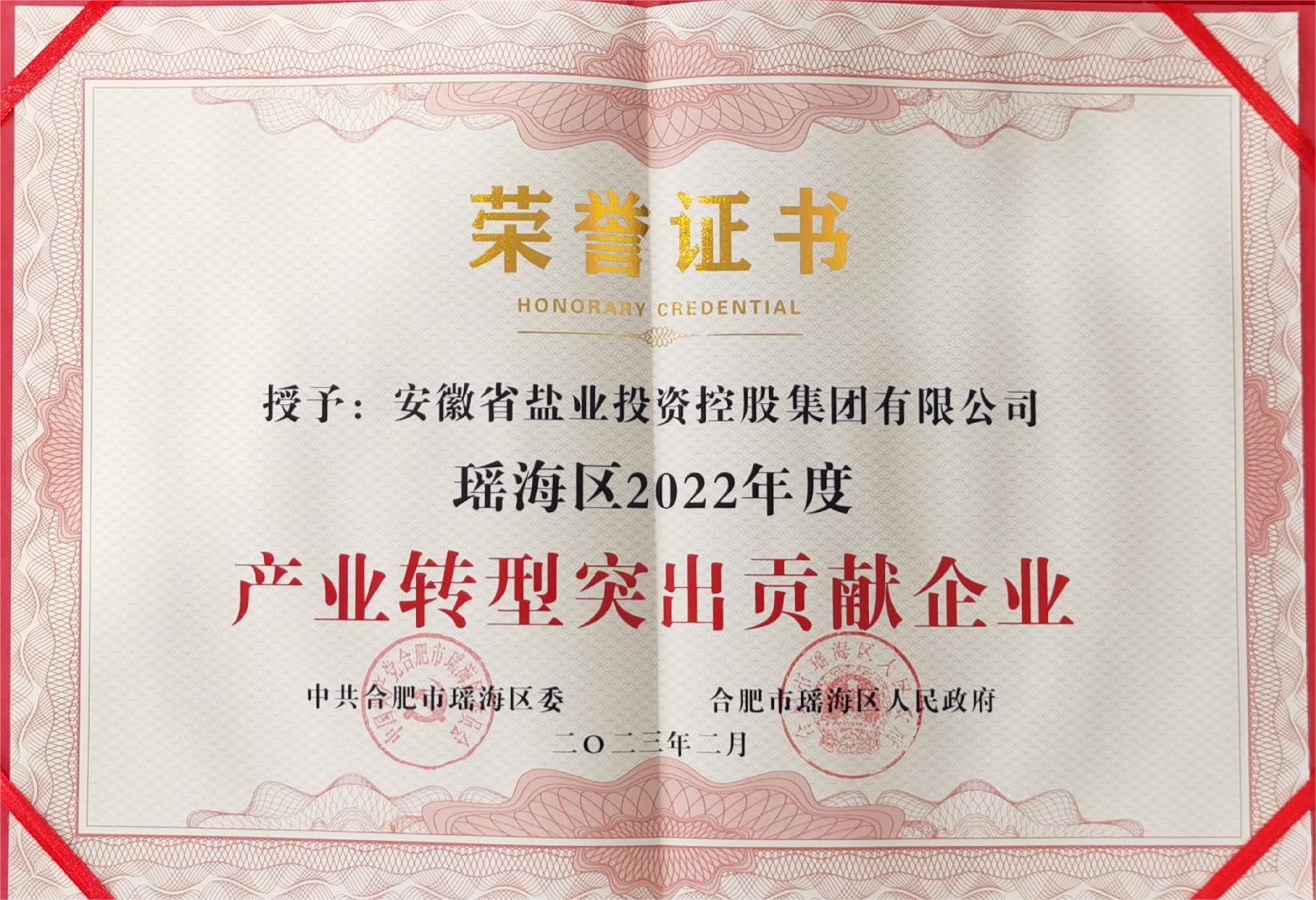 近日,省鹽業(yè)集團(tuán)獲得瑤海區(qū)委、區(qū)政府授予的瑤海區(qū)2022年度“產(chǎn)業(yè)轉(zhuǎn)型突出貢獻(xiàn)企業(yè)”榮譽(yù)稱號。
