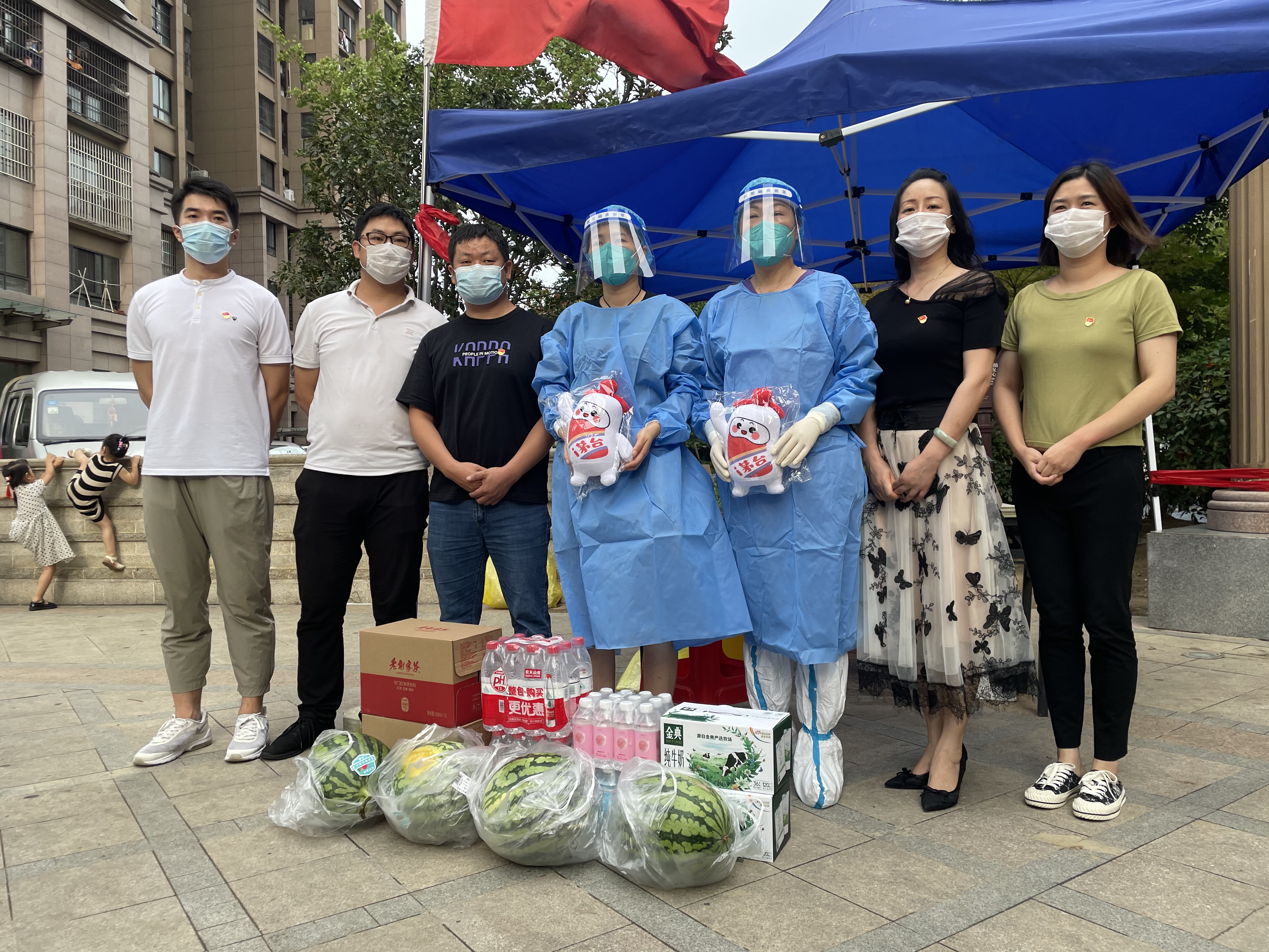 安鹽商貿(mào)公司黨支部為核酸采集人員精心準(zhǔn)備了礦泉水、蘇打水、紅茶飲品、牛奶和西瓜,在烈日里送去一絲絲清涼,并叮囑她們?cè)诟邷叵聻楸Wo(hù)大家生命安全和身體健康的同時(shí)一定要做好自我防護(hù)。