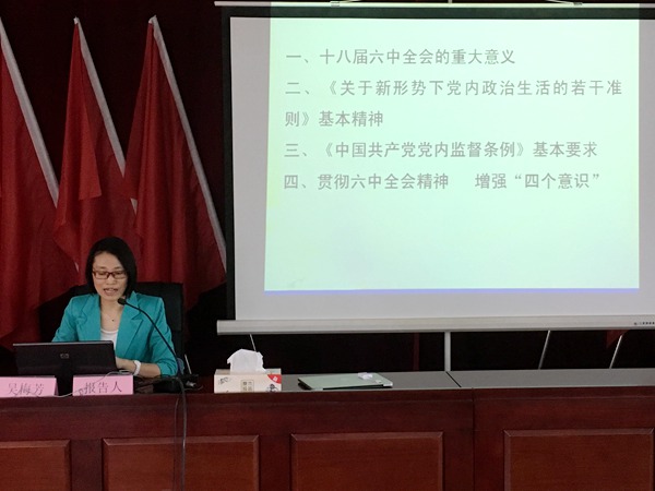 吳梅芳教授從全面從嚴(yán)治黨的高度,深刻闡述了黨的十八屆六中全會(huì)的重大意義,緊緊圍繞加強(qiáng)和規(guī)范黨內(nèi)政治生活的重要性等四個(gè)方面對(duì)《關(guān)于新形勢(shì)下黨內(nèi)政治生活的若干準(zhǔn)則》進(jìn)行了重點(diǎn)解讀,并就《中國(guó)共產(chǎn)黨黨內(nèi)監(jiān)督條例》修訂的內(nèi)容和特點(diǎn)等方面作了提煉分析,對(duì)學(xué)習(xí)貫徹黨的十八屆六中全會(huì)精神、不斷強(qiáng)化“四個(gè)意識(shí)”提出了具體要求。她的報(bào)告系統(tǒng)全面,層次分明,站位高、解讀準(zhǔn)、接地氣,既有理論深度,又有生動(dòng)實(shí)例,對(duì)廣大黨員干部學(xué)習(xí)領(lǐng)會(huì)和掌握黨的十八屆六中全會(huì)精神,全面提升企業(yè)黨建工作水平具有重要的指導(dǎo)意義和促進(jìn)作用。