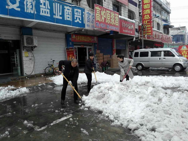 下午黨支部組織黨員干部及職工進行義務(wù)除雪勞動。不但鏟除公司門前的積雪,還進行漕沖糖酒城市場路面積雪清除,以培養(yǎng)黨員的宗旨意識和奉獻精神。