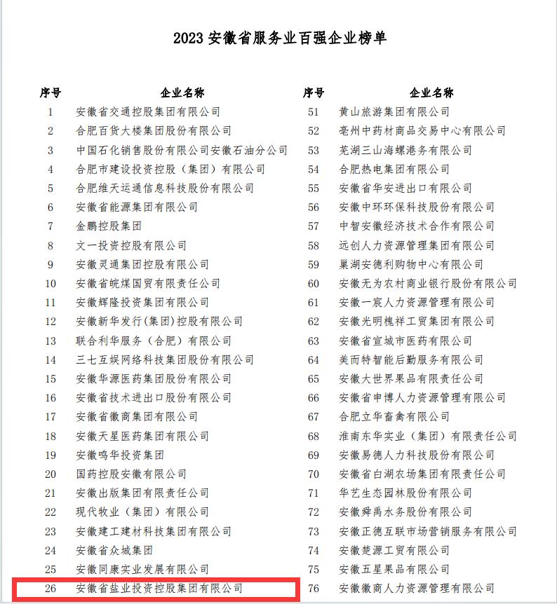 省生態(tài)環(huán)境集團(tuán)(原省鹽業(yè)集團(tuán))入選“2023安徽省百?gòu)?qiáng)企業(yè)”榜單,位列第87位;入選“2023安徽省服務(wù)業(yè)百?gòu)?qiáng)企業(yè)”榜單,位列第26位。這是我公司連續(xù)第4年入選省百?gòu)?qiáng)企業(yè)榜單、省服務(wù)業(yè)百?gòu)?qiáng)企業(yè)榜單。