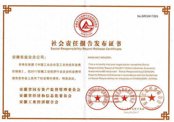7月19日,2017安徽省企業(yè)社會責(zé)任報告發(fā)布會在合肥召開。會上,《安徽鹽業(yè)2016社會責(zé)任報告》公開發(fā)布,這也是省公司連續(xù)第三年公開發(fā)布企業(yè)社會責(zé)任報告。