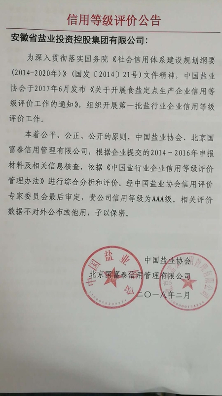 集團公司此次獲得AAA最高信用評級,體現(xiàn)了中鹽協(xié)會、評級機構(gòu)對安徽鹽業(yè)經(jīng)營發(fā)展能力的高度認可,將為集團公司下一步申請食鹽批發(fā)許可證打下堅實基礎(chǔ),同時社會各界、合作伙伴和消費者提供可靠的信用參考。