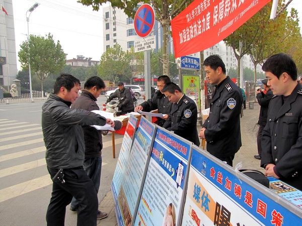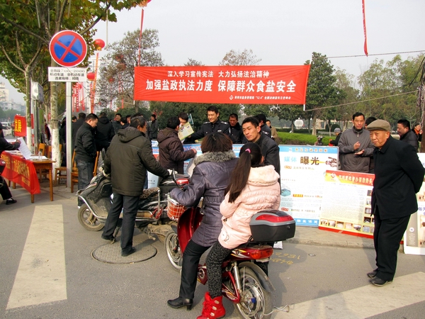 阜陽市鹽務(wù)局高度重視此次宣傳活動,結(jié)合自身業(yè)務(wù)范疇,精心準(zhǔn)備大量法制宣傳資料。早晨7時,天氣陰冷,寒風(fēng)勁吹,我局鹽政執(zhí)法人員在副局長王道亞的帶領(lǐng)下,早早地布置好法制宣傳臺。在活動現(xiàn)場王道亞親自向過往群眾宣傳鹽政法律法規(guī)知識,宣傳消費者、經(jīng)營者的權(quán)利和義務(wù),宣傳消費者如何依法維權(quán);進行了假冒偽劣食鹽展示和鑒別;開展了涉鹽咨詢、受理投訴舉報。此次宣傳共發(fā)放宣傳資料500余份,接受群眾咨詢200余人次?;顒蝇F(xiàn)場布置了咨詢展臺,擺放宣傳圖板10塊、宣傳展架3個、懸掛 2條生動主題橫幅,展示了近期查獲的部分劣質(zhì)私鹽樣品,教市民辨別真假碘鹽的活動,咨詢臺前觀看宣傳圖版和前來咨詢的群眾絡(luò)繹不絕,受到了親自趕赴現(xiàn)場慰問的市人大常委副主任李新才、市政府副市長黃珍、市政協(xié)副主席張永俠、市委宣傳部、市司法局和市依法治市領(lǐng)導(dǎo)小組辦公室有關(guān)領(lǐng)導(dǎo)以及廣大群眾的一致好評。