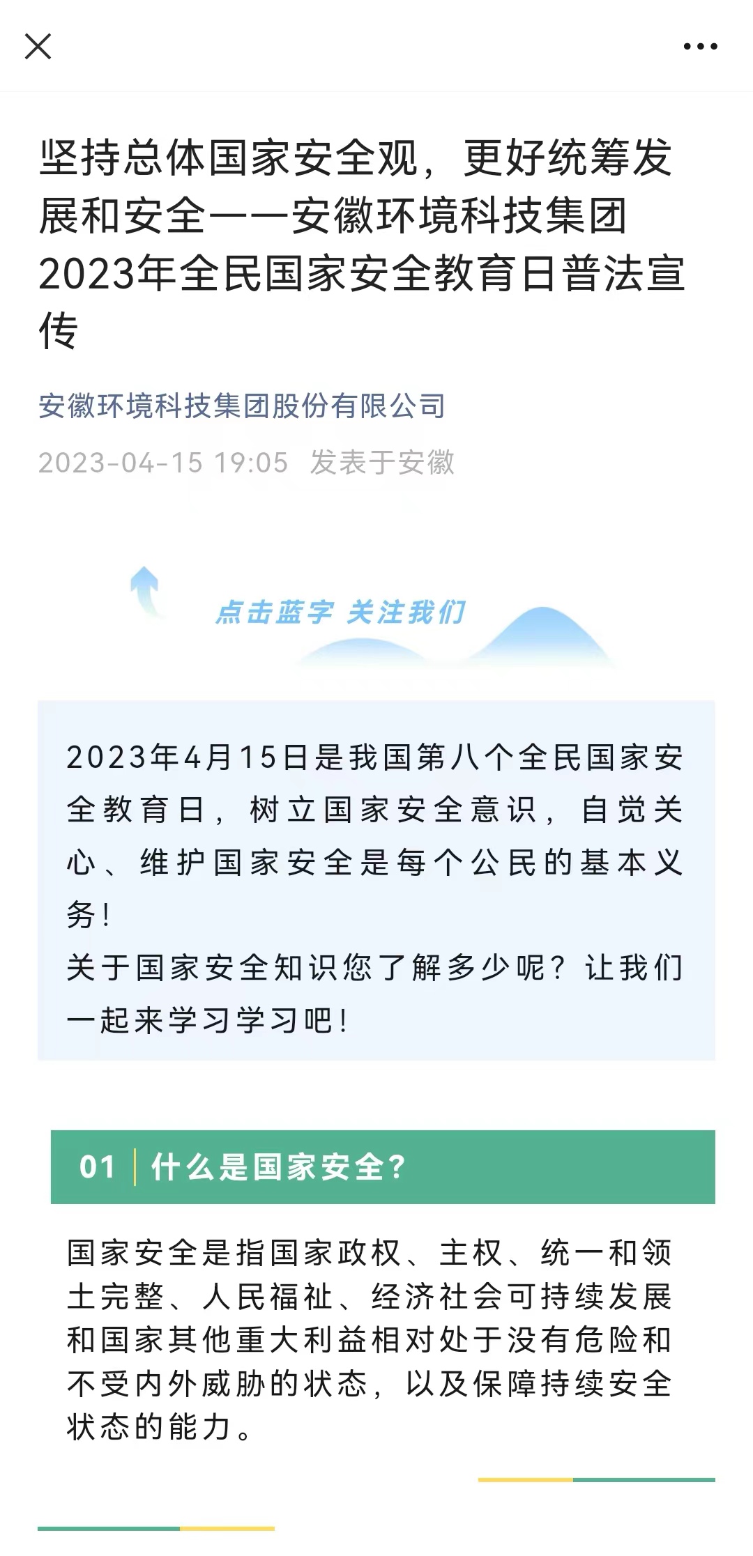 環(huán)境公司、發(fā)展公司、地產(chǎn)集團在微信公眾號、官網(wǎng)政策法規(guī)平臺上傳國家安全相關(guān)法律法規(guī),在辦公場所張貼宣傳海報。