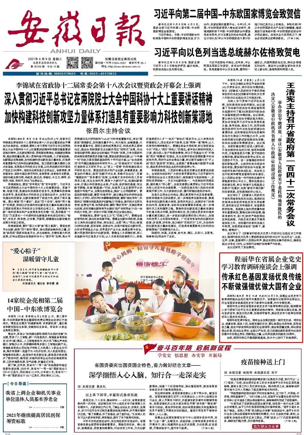 國有企業(yè)發(fā)展史就是一部對黨忠誠、艱苦創(chuàng)業(yè)、銳意改革、服務人民、加強黨建的歷史,要弘揚國企優(yōu)良傳統(tǒng),汲取奮進力量,堅定不移堅持和加強黨的全面領導、推動高質(zhì)量發(fā)展、深化國資國企改革、擔當社會責任、全面從嚴治黨,努力在建設新階段現(xiàn)代化美好安徽中盡好國企責任、貢獻國企力量,以優(yōu)異成績慶祝建黨100周年。