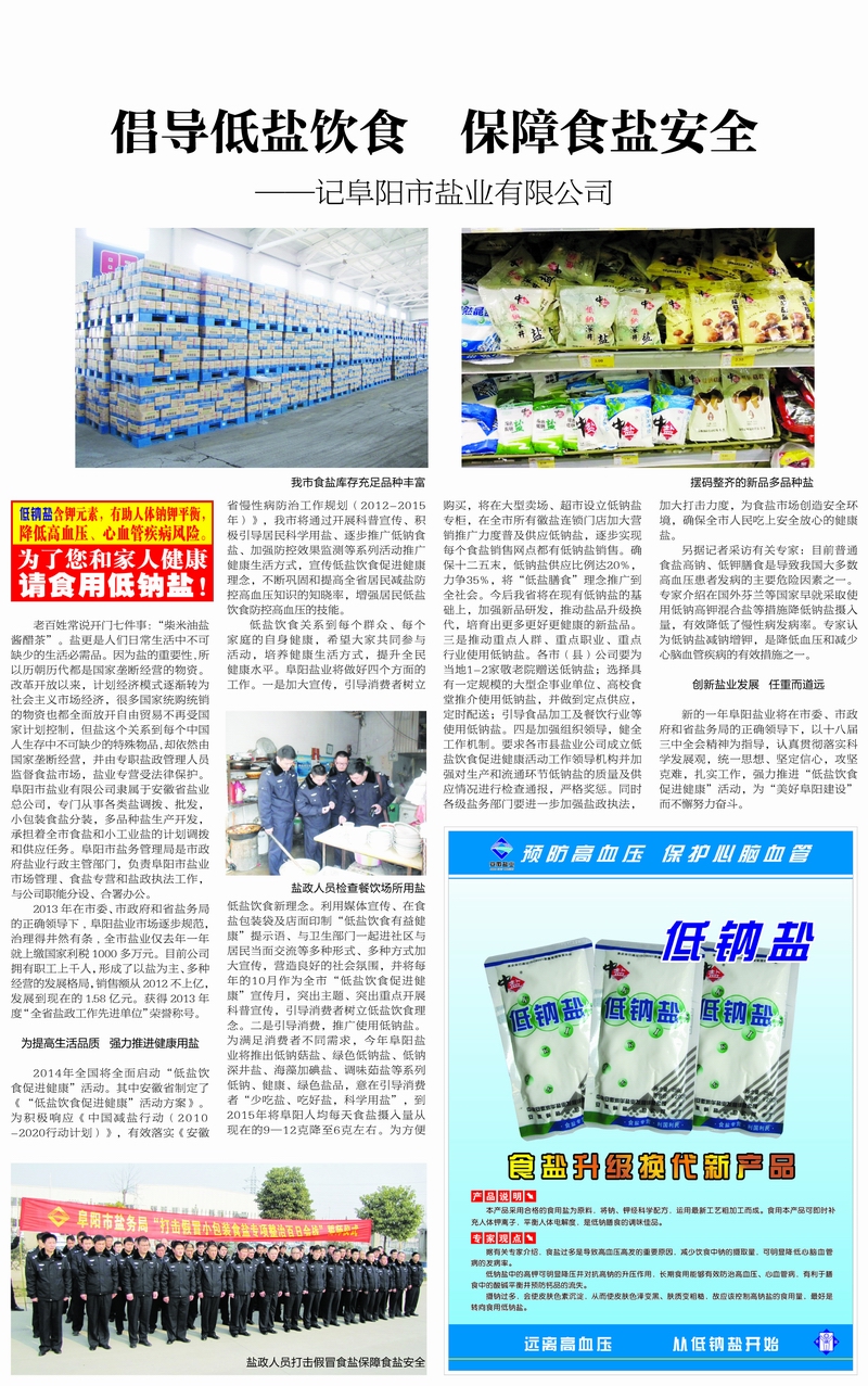 低鹽飲食關(guān)系到每個群眾、每個家庭的自身健康,希望大家共同參與活動,培養(yǎng)健康生活方式,提升全民健康水平。阜陽鹽業(yè)將做好四個方面的工作。一是加大宣傳,引導消費者樹立低鹽飲食新理念。利用媒體宣傳、在食鹽包裝袋及店面印制“低鹽飲食有益健康”提示語、與衛(wèi)生部門一起進社區(qū)與居民當面交流等多種形式、多種方式加大宣傳,營造良好的社會氛圍,并將每年的10月作為全市“低鹽飲食促進健康”宣傳月,突出主題、突出重點開展科普宣傳,引導消費者樹立低鹽飲食理念。二是引導消費,推廣使用低鈉鹽。為滿足消費者不同需求,今年阜陽鹽業(yè)將推出低鈉菇鹽、綠色低鈉鹽、低鈉深井鹽、海藻加碘鹽、調(diào)味菇鹽等系列低鈉、健康、綠色鹽品,意在引導消費者“少吃鹽、吃好鹽,科學用鹽”,到2015年將阜陽人均每天食鹽攝入量從現(xiàn)在的9—12克降至6克左右。為方便購買,將在大型賣場、超市設立低鈉鹽專柜,在全市所有徽鹽連鎖門店加大營銷推廣力度普及供應低鈉鹽,逐步實現(xiàn)每個食鹽銷售網(wǎng)點都有低鈉鹽銷售。確保十二五末,低鈉鹽供應比例達20%,力爭35%,將“低鹽膳食”理念推廣到全社會。今后我市將在現(xiàn)有低鈉鹽的基礎上,加強新品研發(fā),推動鹽品升級換代,培育出更多更好更健康的新鹽品。三是推動重點人群、重點職業(yè)、重點行業(yè)使用低鈉鹽。各市(縣)公司要為當?shù)?-2家敬老院贈送低鈉鹽;選擇具有一定規(guī)模的大型企事業(yè)單位、高校食堂推介使用低鈉鹽,并做到定點供應,定時配送;引導食品加工及餐飲行業(yè)等使用低鈉鹽。四是加強組織領導,健全工作機制。要求各市(縣)鹽業(yè)公司成立低鹽飲食促進健康活動工作領導機構(gòu)并加強對生產(chǎn)和流通環(huán)節(jié)低鈉鹽的質(zhì)量及供應情況進行檢查通報,嚴格獎懲。同時各級鹽務部門要進一步加強鹽政執(zhí)法,加大打擊力度,為食鹽市場創(chuàng)造安全環(huán)境,確保全市人民吃上安全放心的健康鹽。