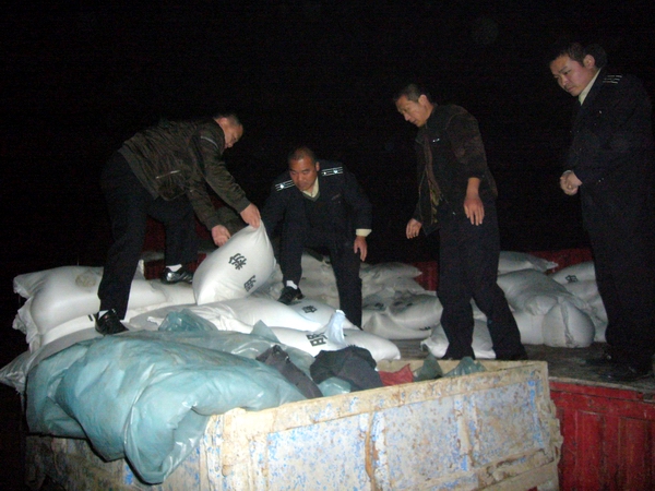 當日夜,市鹽務局鹽政科接群眾舉報,稱有人在聞集鎮(zhèn)兩河口附近交易工業(yè)鹽。潁泉鹽政聯(lián)系聞集派出所協(xié)助。在聞集鎮(zhèn)兩河口附近的河壩上,執(zhí)法人員發(fā)現(xiàn)有人正在從贛籍紅色解放牌大貨車上往機動三輪車上卸白色袋裝物。執(zhí)法人員控制了現(xiàn)場人員和車輛,經(jīng)清點貨車上載有標注“元明粉”的白色塑編袋鹽產品共計360包,約18噸,鹽產品經(jīng)現(xiàn)場碘試劑測試不含碘。