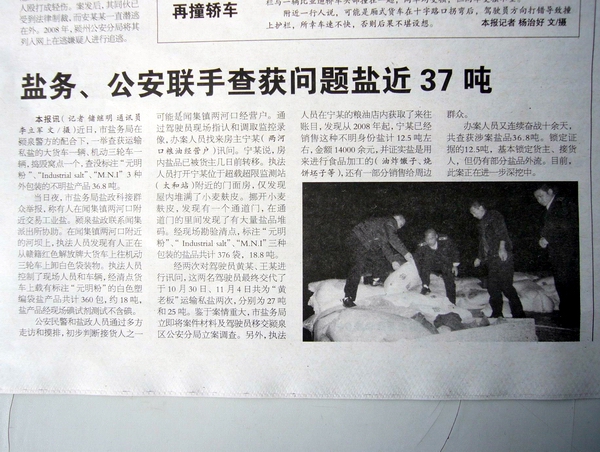 本報訊(記者 儲繼明 通訊員 李立軍 文/攝)日前,市鹽務局在潁泉警方的配合下,一舉查獲運輸私鹽大貨車一輛、機動三輪車一輛、搗毀窩點一個、查沒標注“元明粉”、“Industrial salt”、“M.N.I”三種外包裝的不明鹽產品36.8噸。