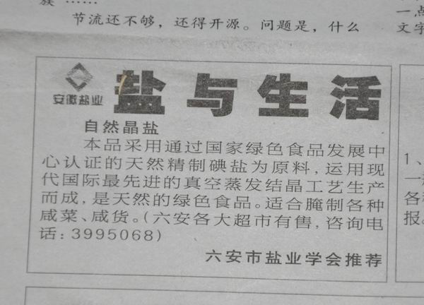 為了提高企業(yè)知名度,優(yōu)化鹽品銷售結(jié)構(gòu),滿足市民不同層次的鹽品消費(fèi)需求和挖掘潛在需求,自今年“3.15消費(fèi)者權(quán)益保護(hù)日”開始,六安市公司在當(dāng)?shù)匕l(fā)行量最大的地方平面媒體《大別山晨刊》上,開設(shè)“鹽與生活”專欄。通過專欄形象設(shè)計(jì),增強(qiáng)消費(fèi)者的視覺感受,吸引讀者的眼球;通過刊載貼近百姓生活的可讀性內(nèi)容,拓展鹽品使用寬度。
