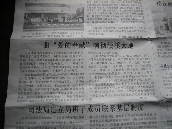 縣鹽業(yè)公司職工胡亞宏于2007年經(jīng)南京軍區(qū)醫(yī)院診斷患了“慢性腎衰竭”,為控制病情,走遍北京、南京、上海、蕪湖等各大醫(yī)院掛專家門診,這幾年一直用藥物控制,每年醫(yī)療費(fèi)2萬(wàn)余元;今年3月胡亞宏病情惡化,醫(yī)生建議需作腎移植手術(shù),目前在福州軍區(qū)總醫(yī)院進(jìn)行腎配型,手術(shù)費(fèi)用大約40余萬(wàn)元。