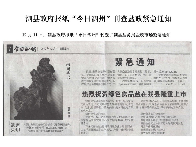 《今日泗州》刊登泗縣鹽務局鹽政市場緊急通知