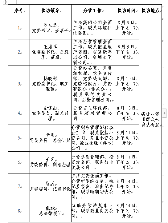根據(jù)工作安排,現(xiàn)就省鹽業(yè)集團領(lǐng)導(dǎo)班子成員8月份接待省鹽業(yè)系統(tǒng)職工群眾來訪安排公示如下: