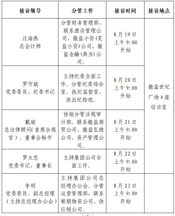 根據(jù)工作安排,現(xiàn)就省生態(tài)環(huán)境集團(tuán)領(lǐng)導(dǎo)班子成員8月份接待群眾來(lái)訪安排公示如下: