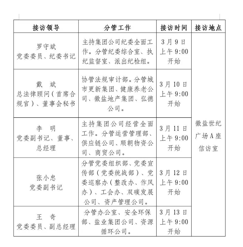 根據(jù)工作安排,現(xiàn)就省生態(tài)環(huán)境集團領(lǐng)導(dǎo)班子成員3月份接待群眾來訪安排公示如下: