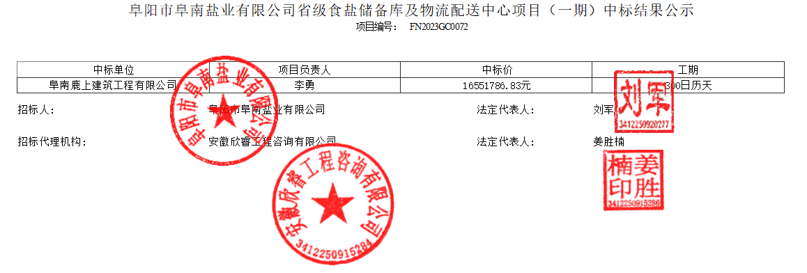 阜陽市阜南鹽業(yè)有限公司省級食鹽儲備庫及物流配送中心項目(一期)中標(biāo)結(jié)果公示