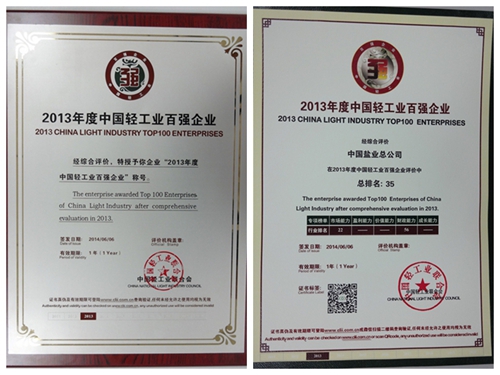 6月6日,中國輕工業(yè)聯(lián)合會在北京京西賓館舉辦了以“新經(jīng)濟(jì)、新模式、新視角”為主題的“第三屆中國輕工企業(yè)家高峰論壇暨輕工百強(qiáng)企業(yè)頒獎盛典”。大會發(fā)布了“2013年度中國輕工業(yè)百強(qiáng)企業(yè)”榮譽榜單,中鹽總公司榮獲“2013年度中國輕工業(yè)百強(qiáng)企業(yè)”稱號,在2013年綜合百強(qiáng)榜單中排名35位,并獲市場能力專項排名第22名。