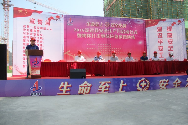6月12日,定遠(yuǎn)縣在徽鹽曲陽現(xiàn)代城開展了以“生命至上,安全發(fā)展”為主題的2018年安全生產(chǎn)月啟動(dòng)儀式暨物體打擊事故應(yīng)急救援演練活動(dòng)??h直相關(guān)職能單位規(guī)建局、安監(jiān)局、公安局、衛(wèi)計(jì)委等負(fù)責(zé)人、徽鹽地產(chǎn)副總經(jīng)理黎元忠、徽鹽地產(chǎn)定遠(yuǎn)項(xiàng)目相關(guān)人員等出席了活動(dòng)。