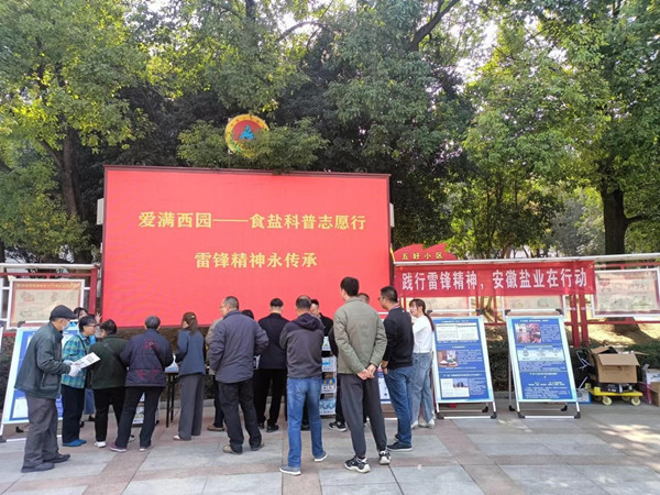 活動(dòng)現(xiàn)場(chǎng),通過擺放宣傳展架、低鈉鹽、生活用鹽展臺(tái)、懸掛“踐行雷鋒精神,安徽鹽業(yè)在行動(dòng)”橫幅、大屏幕投放主題標(biāo)語(yǔ)等,營(yíng)造了濃厚的活動(dòng)氛圍。志愿服務(wù)隊(duì)向社區(qū)居民免費(fèi)發(fā)放宣傳單頁(yè)、控鹽量勺、綠色低鈉鹽等物品,為居民如何健康用鹽答疑解惑,宣傳科學(xué)補(bǔ)碘知識(shí),倡導(dǎo)低鈉飲食消費(fèi)理念,贏得了社區(qū)居民廣泛好評(píng)。