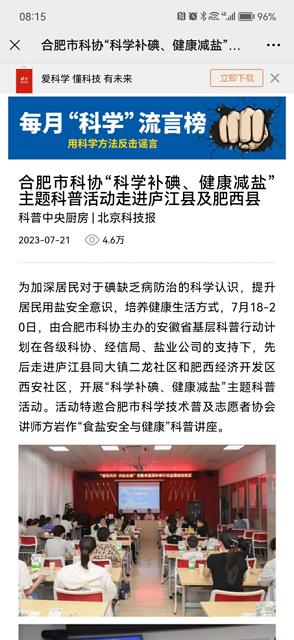 如何科學(xué)補(bǔ)碘?怎樣科學(xué)食用鹽?為提升居民用鹽安全意識,培養(yǎng)健康生活方式,7月下旬,由合肥市科協(xié)主辦的“惠民興村、共創(chuàng)名城”安徽省基層科普行動計(jì)劃先后走進(jìn)廬江縣同大鎮(zhèn)二龍社區(qū)、肥西縣經(jīng)濟(jì)開發(fā)區(qū)西安社區(qū)、巢湖市伍賈社區(qū),開展“科學(xué)補(bǔ)碘、健康減鹽”主題科普活動。