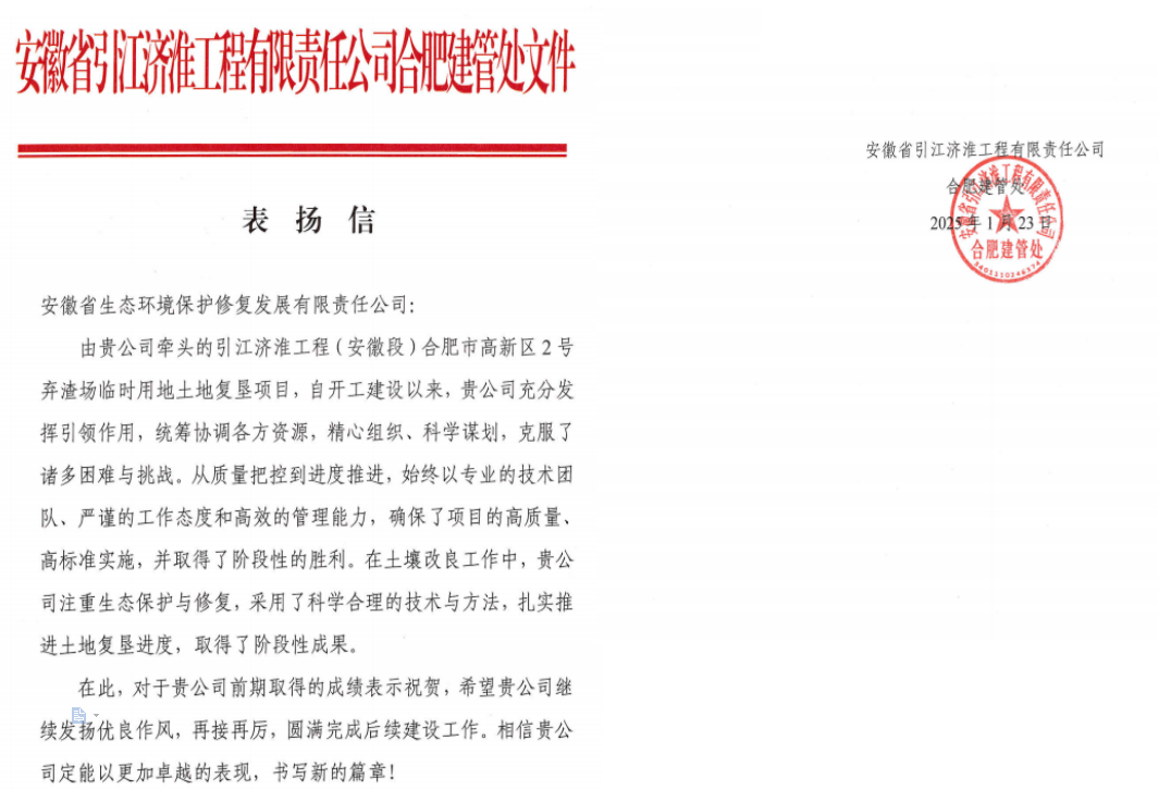 新年的第一封表揚信帶著溫暖而至,1月23日,安徽省引江濟(jì)淮工程有限責(zé)任公司合肥建管處致表揚信,信中對生態(tài)修復(fù)公司牽頭的引江濟(jì)淮工程(安徽段)合肥市高新區(qū)2號棄渣場臨時用地土地復(fù)墾項目的建設(shè)質(zhì)量、進(jìn)度推進(jìn)以及土壤改良等方面的工作給予充分肯定,對項目部同事的專業(yè)素養(yǎng)和工作作風(fēng)給予高度贊揚。
