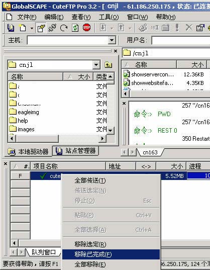 ★作好上述設(shè)置好,在"站點管理器"窗口中,雙擊剛才建立的上傳站點,就可以登錄到服務(wù)器了。 ★成功登錄服務(wù)器后,窗口自動跳轉(zhuǎn)到左邊的"本地驅(qū)動器"子窗口中,選擇你要上傳的一個或多個本地文件,然后右擊選擇"上傳"就可以了。 ★你可以點擊最上面的"stop"圖標(biāo)停止上傳,如果要繼續(xù)上傳,右擊下面?zhèn)鬏旉犃兄械牡奈募,選擇"全部傳送"或者"傳送選定"即可。也可以選擇"移除選定"或者"全部移除"等菜單刪除傳輸隊列。如圖4。